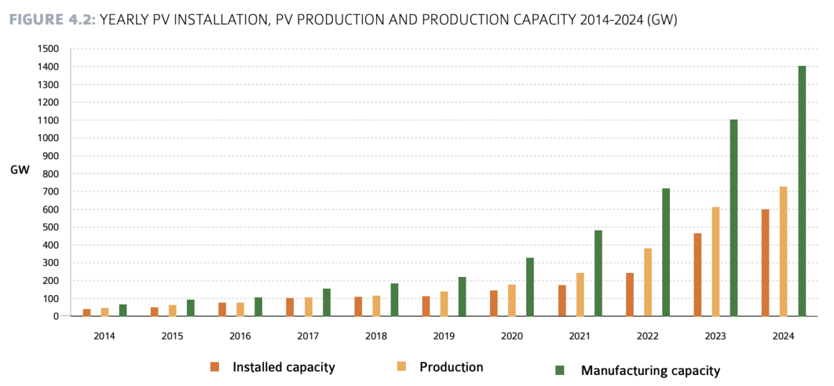 Prema najnovijem izvješću Međunarodne agencije za energiju (IEA), 2024. godina bila je još jedno rekordno poglavlje u povijesti solarne energije. Diljem svijeta instalirano je između 553 i 601 gigavata novih fotonaponskih kapaciteta, čime je ukupna globalna snaga premašila 2260 gigavata. Više od 60 posto novih sustava čine velike elektrane koje energiju izravno isporučuju u mrežu, dok su preostalih 228 gigavata ostvarile manje, decentralizirane instalacije na krovovima i poslovnim objektima.
